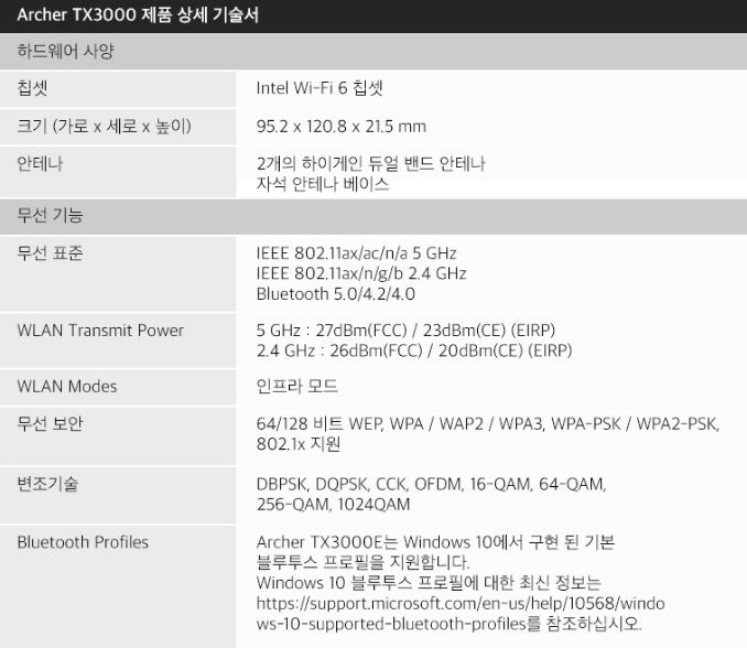 TX3000E 무선랜카드는 프리미엄 메인보드에 기본으로 장착된 무선 랜카드를 저가형 또는 보급형 시스템에서도 사용할 수 있는 제품으로 기본으로 WPA3 보안 기술 적용과 2.4 GHz - 574 Mbps, 5 GHz - 2402 Mbps 등 토탈 AX3000 속도 지원 그리고 블루투스 5.0을 지원하는 게 특징인데요.