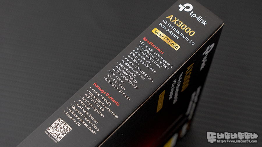 TX3000E 무선 랜카드 패키지 전면에는 AX3000 속도의 Wi-Fi6 지원과 PCIe 카드와 무선 안테나가 인쇄되어 제품의 모습을 확인할 수 있으며 패키지 뒷면에는 제품의 특징이 인쇄되어있습니다.