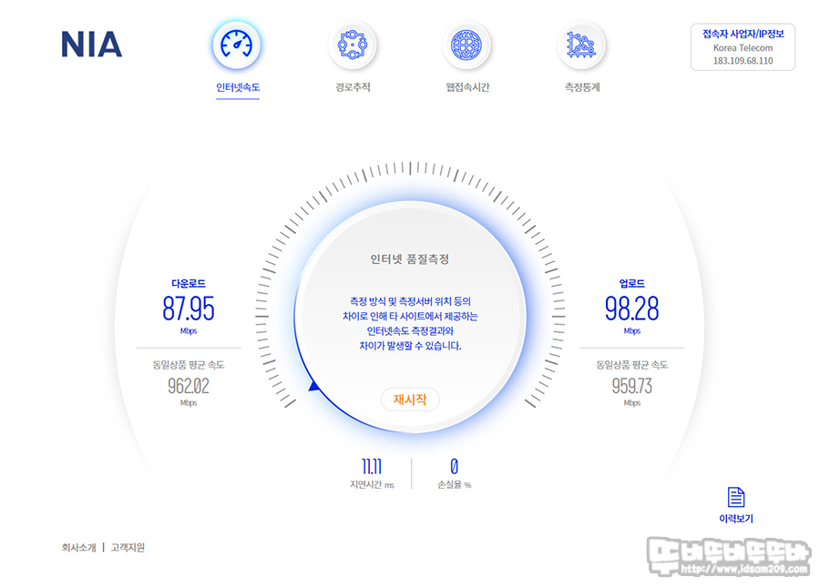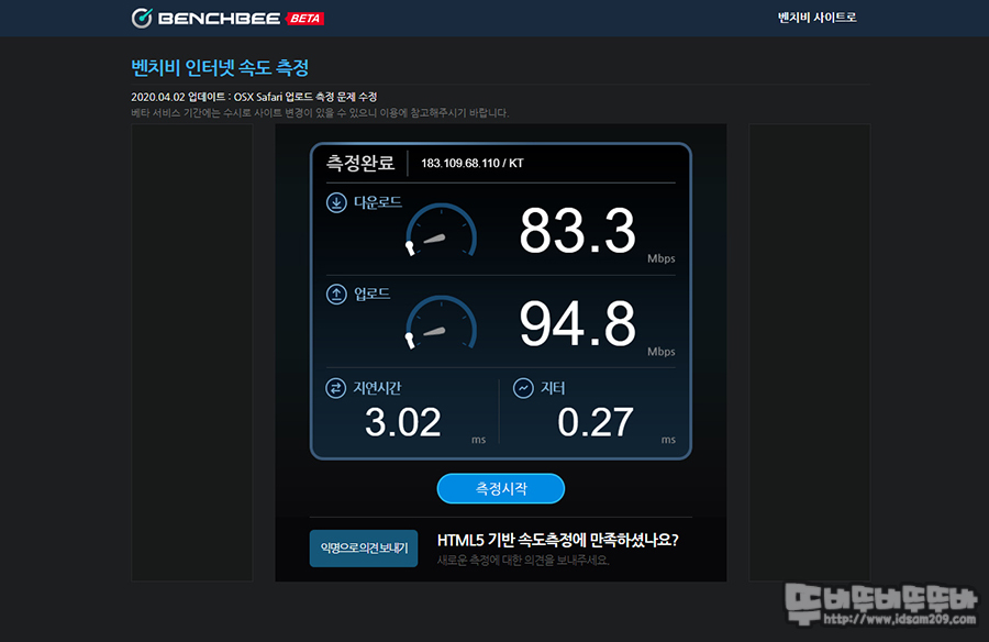 테스트를 진행하는 사무실의 네트워크 구성은 KT 기가 인터넷 모뎀 → IPTIME 100 Mbps 유무선 공유기 → 100 Mbps 지원하는 랜카드를 장착된 시스템이 사용되고 있는 구성으로 무선 인터넷 테스트 시 100Mbps 속도에 가까운 속도를 보여주고 있습니다.