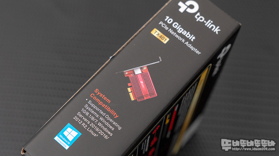 티피링크 유선랜카드 TX401 패키지에는 10기가 비트 속도와 3년 무상 보증 스티커 그리고 제품 실제 모습이 인쇄되어있는데요.