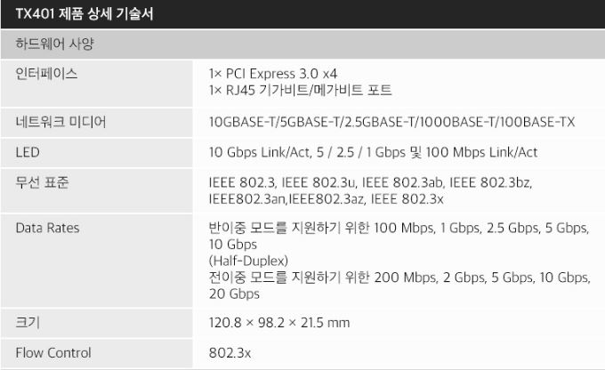 스펙 정보를 살펴보면 10GB / 5GB / 2.5GB / 1GB / 100MB 전송속도를 모두 지원하며 PCI-Express 3.0 x4 배속 슬롯 베이스를 이용하는 제품임을 확인할 수 있습니다.