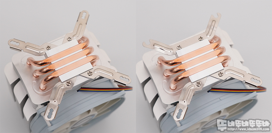 인텔 CPU의 경우 4개의 스마트 클립을 이용하여 조립하는 방법(좌), 고정 볼트에 걸어서 채결하는 이지 크립과 스마트 클립 2개를 이용하는 조립방법(우)이 가능하니 편한 방식으로 사용하기 바랍니다.