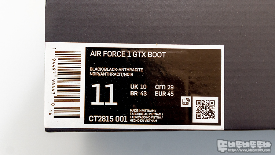에어 포스 1 GTX (GORE-TEX) 부트 / 신발 사이즈는 290cm / 상품코드 CT2815-001와 고어텍스가 사용되었다는 로고 스티커를 확인할 수 있습니다.