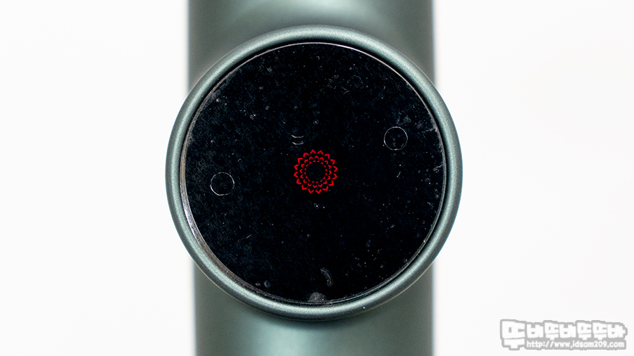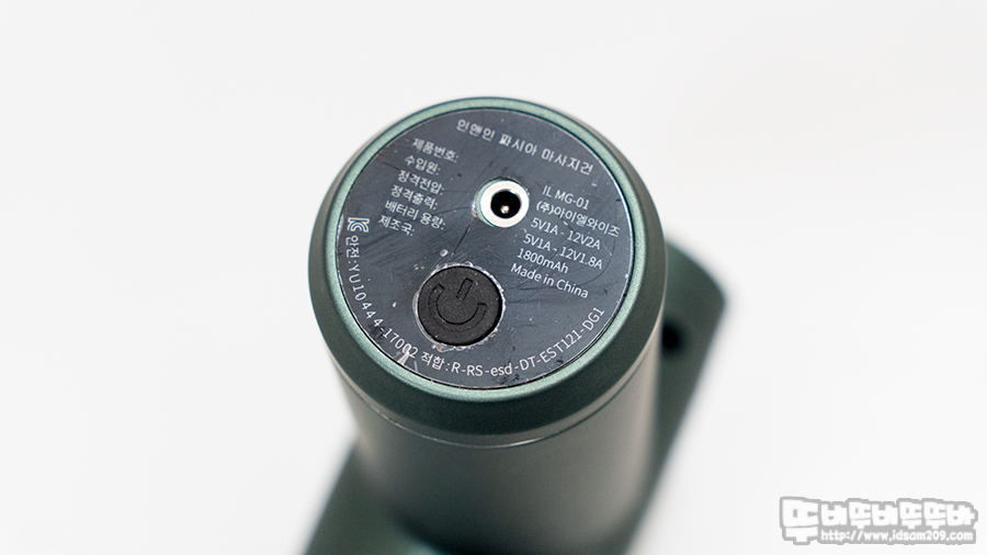 마사지 건의 상단 부는 모터가 구동 시 발생하는 열기를 배출하는 환기구로 디자인되었으며 바닥면에는 전원 충전용 소켓과 전원 On/Off 스위치로 구성되어있고요.