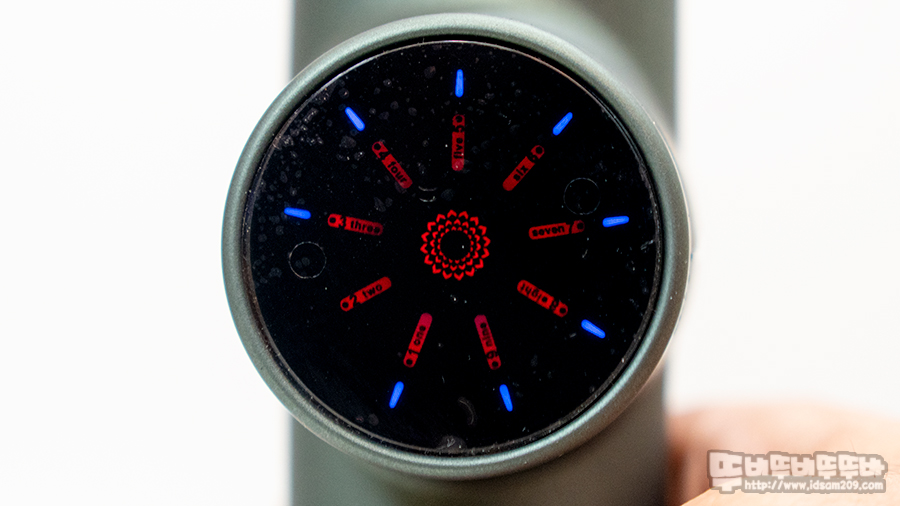 바닥면의 전원 버튼을 1회씩 눌러주면 마사지 건 뒷면에 LED로 영어로 one / two / three / four / five / six / seven / eighty / nine으로 단계가 올라가며 해당 강도의 숫자가 점멸하여 표시가 되는데 테두리에 Blue LED가 회전하기에 조금산만 한 느낌이 있습니다.