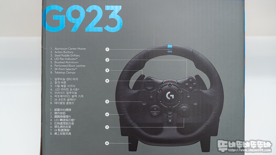 로지텍 G923 트루포스 피드백 레이싱 휠 패키지 모습입니다.