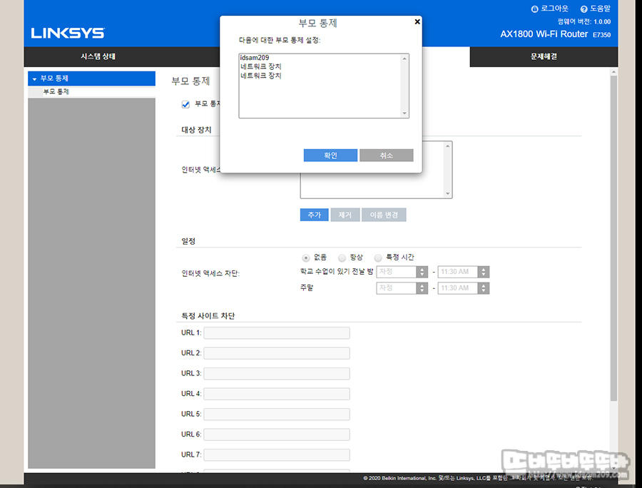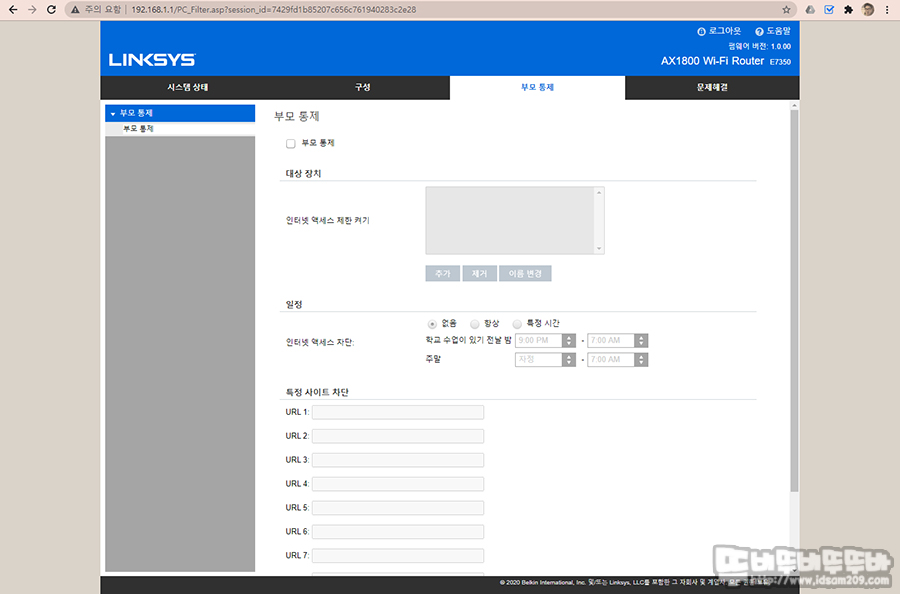 부모 통제 메뉴에서는 라우터에 연결된 특정 기기를 선택하여 사용 시간을 제한하거나 특정 URL를 차단하는 형태로 제어가 가능합니다.