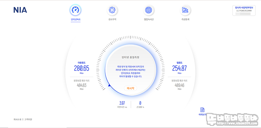 인터넷 속도 벤치 프로그램으로 체크 280.65 Mbps 다운 속도와 254.87 업로드 속도를 보여주고 있는데 아이폰을 이용한 속도와 비슷한 것을 확인할 수 있습니다.