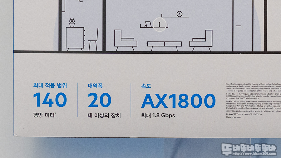 링크시스 E7350 듀얼밴드 AX1800 WiFi 6 무선 공유기의 패키지에는 친절하게도 한글로 표기된 다양한 정보 중 가장 눈에 들어오는 부분이 140 평방미터 (42.35평)의 커버리지 영역과 20개의 장치 동시 연결 지원, WiFi 6 규격의 AX1800 속도를 지원하는 내용입니다.
