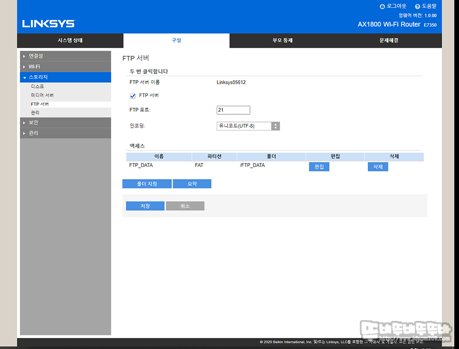 이후 FTP 서버 메뉴에서 "FTP 서버" 활성화 후 "폴더 지정"을 선택하여