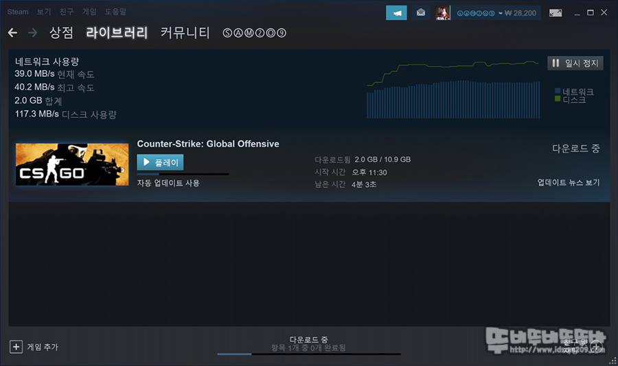 프롬프트 명령으로 확인해본 인터페이스 정보에서는 수신 속도 1201, 전송 속도 1201, 신호 95%로 양호한 상태임을 확인할 수 있었으며 스팀을 통해 게임을 다운로드 시 나름 빠른 속도로 다운로드가 가능했습니다.