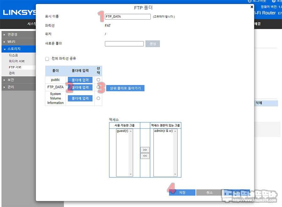 스토리지 - 디스크 메뉴의 "공유 생성"을 선택하여 위의 1, 2, 3, 4, 5 순으로 FTP_DATA를 공유 폴더로 설정했습니다.