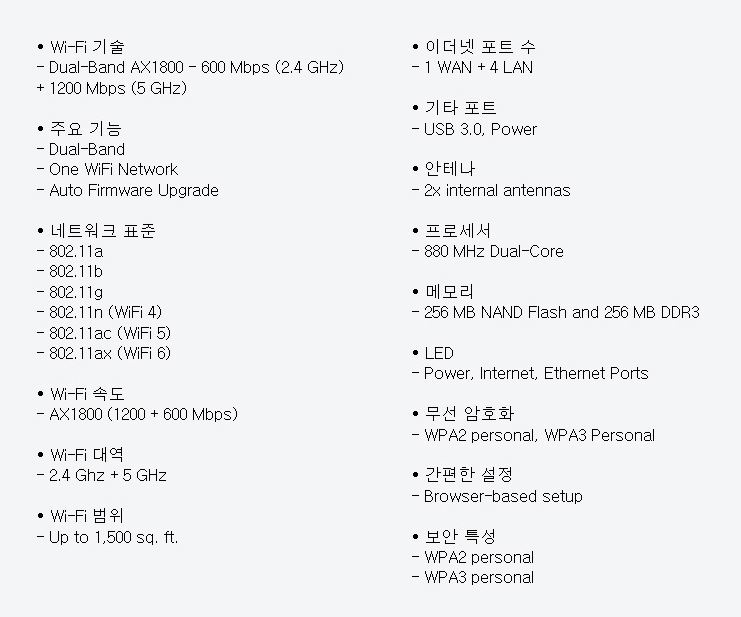 무선 속도 : 2.4 GHz 600 MHz + 5 GHz 1200 Mbps = AX1800 (WiFi 5 AC 지원 제품보다 4배 빠른 속도를 지원)