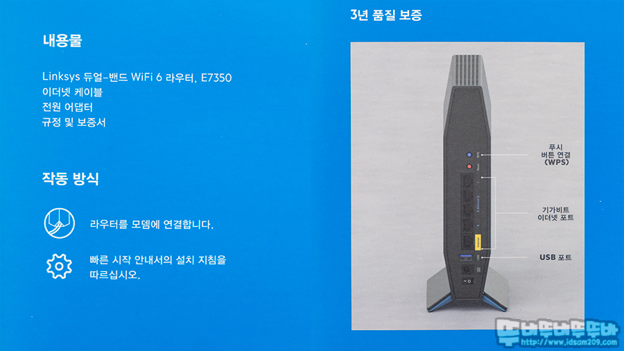 내용물 설명과 3년 품질보증, 그리고 공유기의 포트 구성에 대한 설명을 확인할 수 있네요.