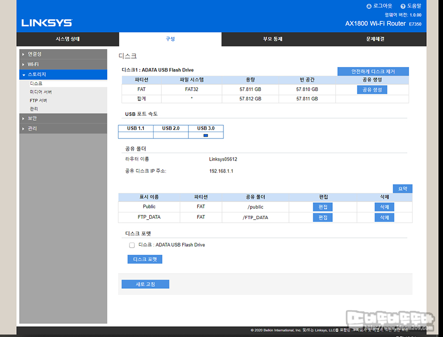 스토리지 메뉴에서는 USB 포트에 꼽힌 USB 메모리의 상태를 보여주는 메뉴로 USB 용량, USB 메모리 속도, 내부 폴더 정보와 포맷 기능을 지원하는데요.
