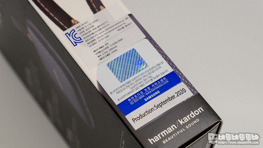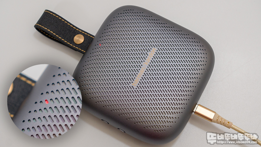 특히 스피커 전면에는 기다란 도트 느낌의 타공 디자인 그리고 중앙에 위치한 브랜드의 아이덴티티인 하만/카돈 로고 각인인 돋보이며 넓은 타공 면적임에도 1m 깊이 담수에서 30분간 방수 가능한 등급인 IPX7을 지원하는 특수성이 아웃 도어에 강한 면모를 느끼게 해 줍니다.