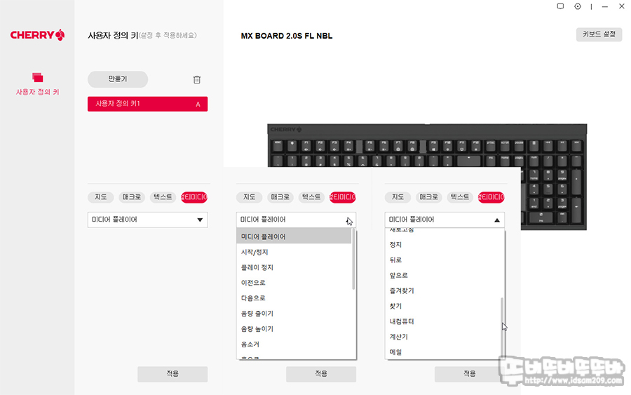 체리 키보드는 레이어를 지원하지 않기에 키 매크로 또는 텍스트 매크로 입력 시 문자 입력이나 게임 플레이 시 간섭이 없는 키패드에 부여하는 게 좋으니 참고하시기 바랍니다.