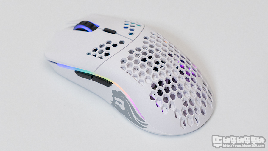 마우스 좌/우 측면에 인쇄된 Glorious 로고 모습.