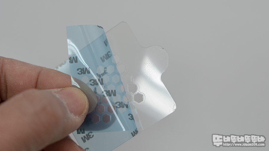 허니콤 모양의 타공 처리된 스텐실을 안쪽 면에는 점성이 있어 CPU 금속 표면인 히트프레스에 부착 시 접착력으로 고정되어 안정적인 서멀구리스 도포가 가능합니다.