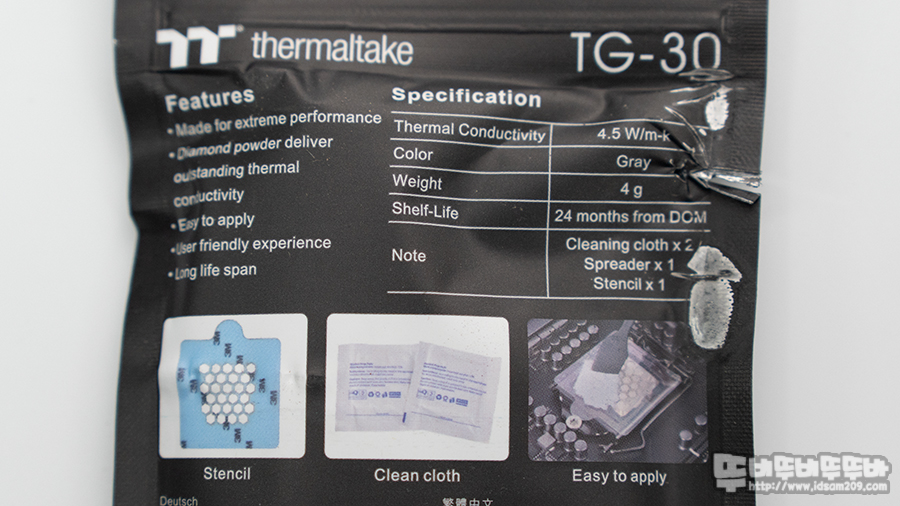 비닐 지퍼백으로 포장된 써멀테이크 서멀컴파운드 TG-30은 4g 용량의 그레이 컬러의 구리스로 열전도율 4.5W/mk를 가졌으며 점도가 약간 있는 편이라 도포하는데 큰 어려움은 없는 편입니다.