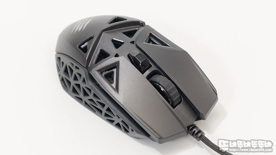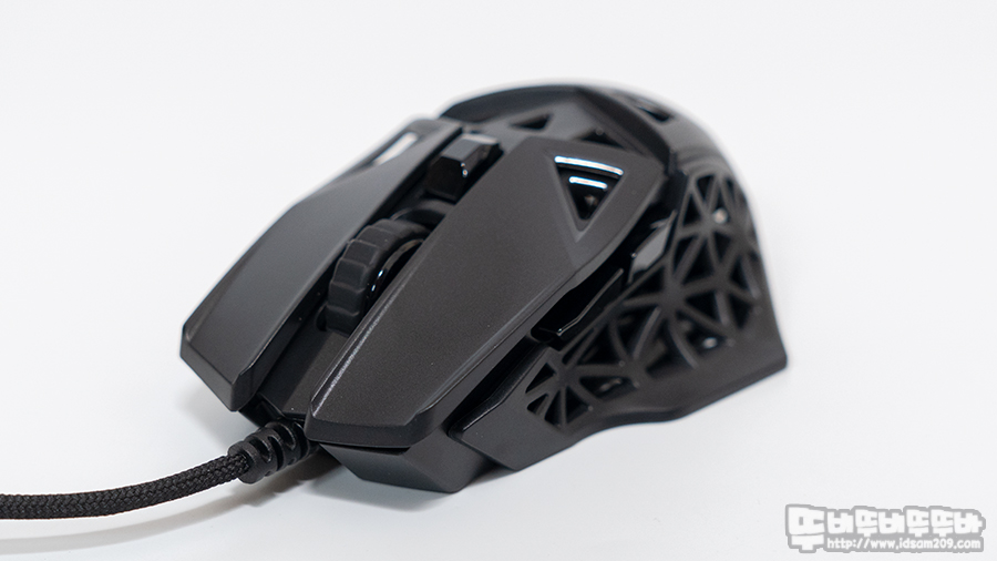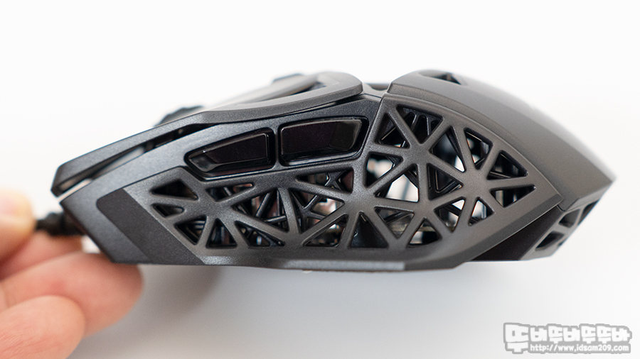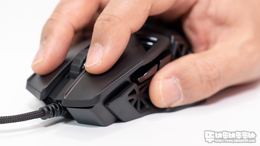 사이드 면 삼각형 타공 경계 부분이 라운드 처리로 마감되어 마우스 그립 시 날카로운 모서리가 느껴지지 않으며 약간의 경사각을 가지고 있는 왼쪽 사이드 날개 부분 또한 엄지손가락 파지 시 손이 닿는 부분에 타공면에 대한 거부감이 느껴지지 않고 일반 마우스를 만지는 느낌으로 다가왔습니다.