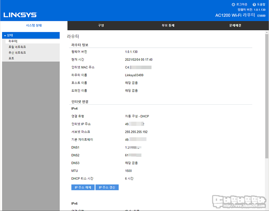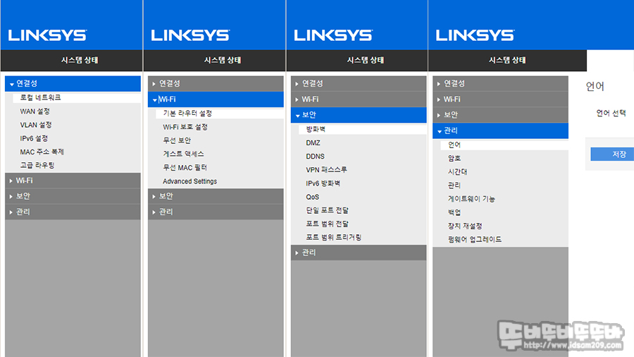 노란색 인터넷(Wan) 포트에는 통신사 모뎀과 연결하는 랜 케이블을, 랜 포트 1번은 PC와 연결하여 링크시스 E5600의 성능 및 관리자 메뉴를 살펴보겠습니다.