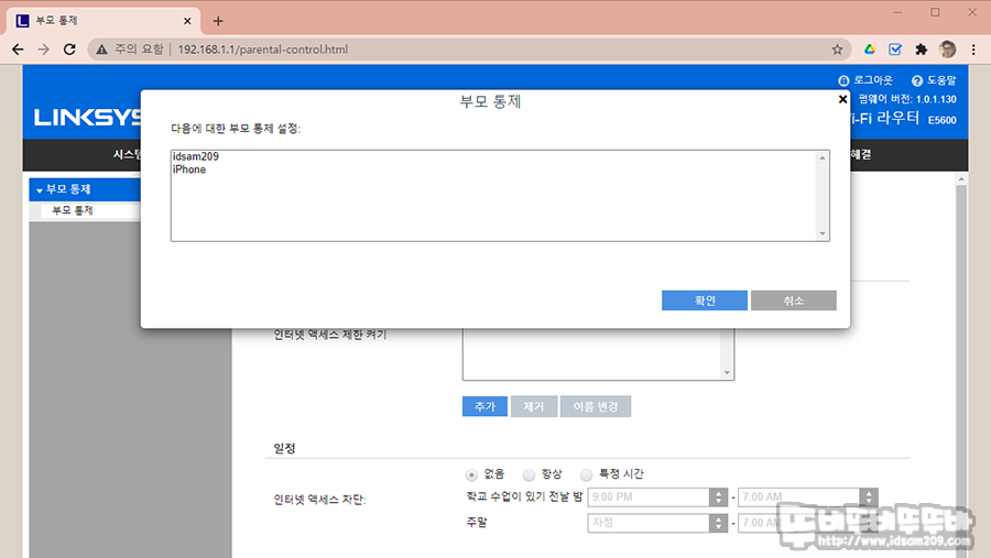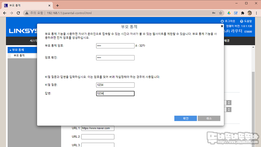 어??? 링크시스 E5600에는 부모 통제 설정 시 부모 통제를 설정하는 사람만 들어갈 수 있는 별도의 암호를 설정하게 되네요.