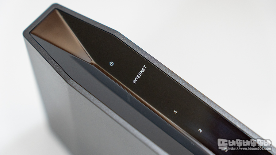 전면의 LED 인디케이터는 V 골 형태의 유광 플라스틱이 사용된 입체감을 주는 디자인으로 전원, 인터넷 회선의 연결 상태, 4개 기가비트 랜 포트의 작동상태를 한눈에 파악할 수 있습니다.