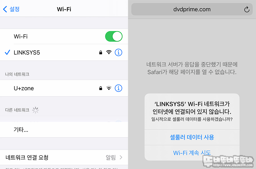 아이폰에서 Wi-Fi로 인터넷이 안 되는 모습.