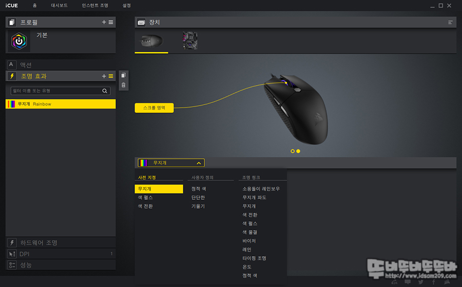 조명 효과에서는 다양한 RGB LED 효과를 선택하여 휠 스크롤에 적용할 수 있었습니다.