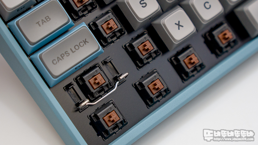 전체적으로 안정적인 체리 MX 갈축 스위치 느낌이며 스테빌라이저 부분에 윤활 처리로 잡소음이 없는 키 느낌을 주었고 간혈적으로 들리는 통울림과 스프링 소리는 대부분의 기성품이 가지고 있는 수준이니 참고하시기 바랍니다.