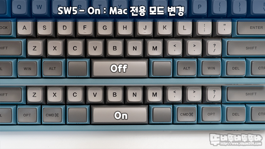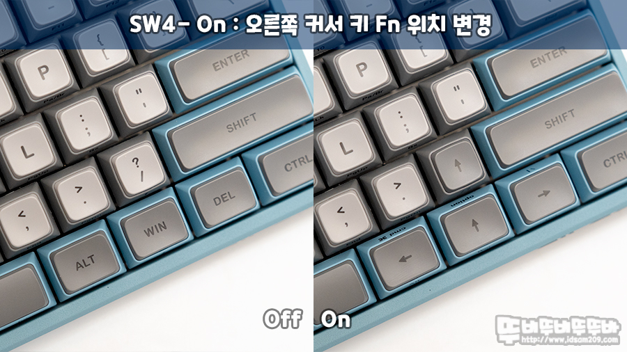 스위치 4번의 경우 On으로 설정 시 Fn 키로 사용했던 방향키가 전면에 활성화되며 스위치 5번의 경우 MAC 용 전용 모드로 사용하게 됩니다.