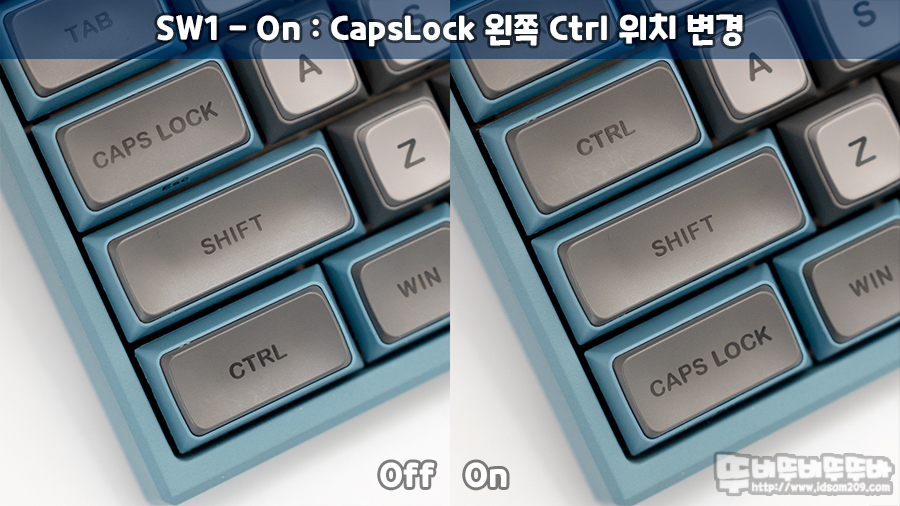 스위치 1번 On으로 설정 시 Caps Lock / R_Ctrl 위치 변경이 가능하며 스위치 2번 On으로 설정 시 Caps Lock을 ESC로 기본 사용, Fn 조합으로 Caps Lock 기능으로 사용할 수 있습니다.