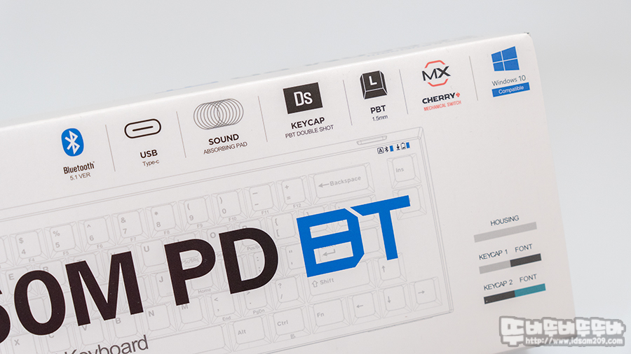 블루투스 버전 5.1, USB-C 단자, 흡음재, PBT Double shot, PBT 1.5mm, 체리 MX 스위치, 윈도우10 호환 등 제품의 포인트 특징을 확인할 수 있습니다.