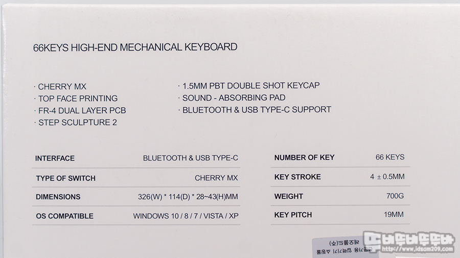 키 배열 66 키 / 체리 MX 스위치 / 정각 인쇄 / FR-4 듀얼 레이어 기판 사용 / 스텝 스컬쳐 2, 1.5mm PBT 이중사출 키캡 / 흡음재 사용 / 블루투스 & USB-C 유선 사용 / 326 * 114 * 28~43mm / 무게 700g