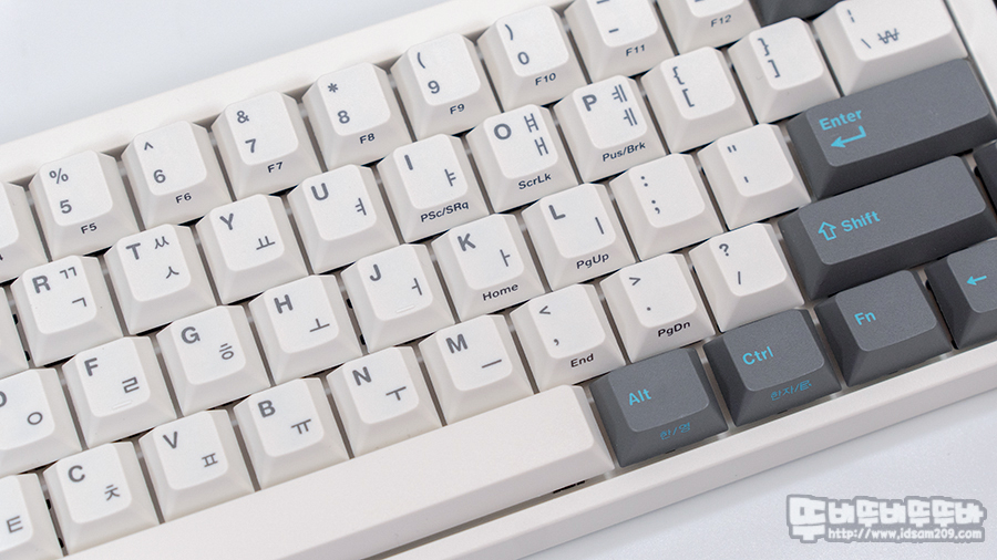 레오폴드 FC660MBT PD 키캡은 PBT 이중사출로 제작된 화이트 베이스의 블랙 각인으로 명도 대비를 그레이 베이스에 블루 계열 각인으로 채도 대비로 각인 폰트의 시각적인 집중력을 높여주고 있는 게 특징입니다.