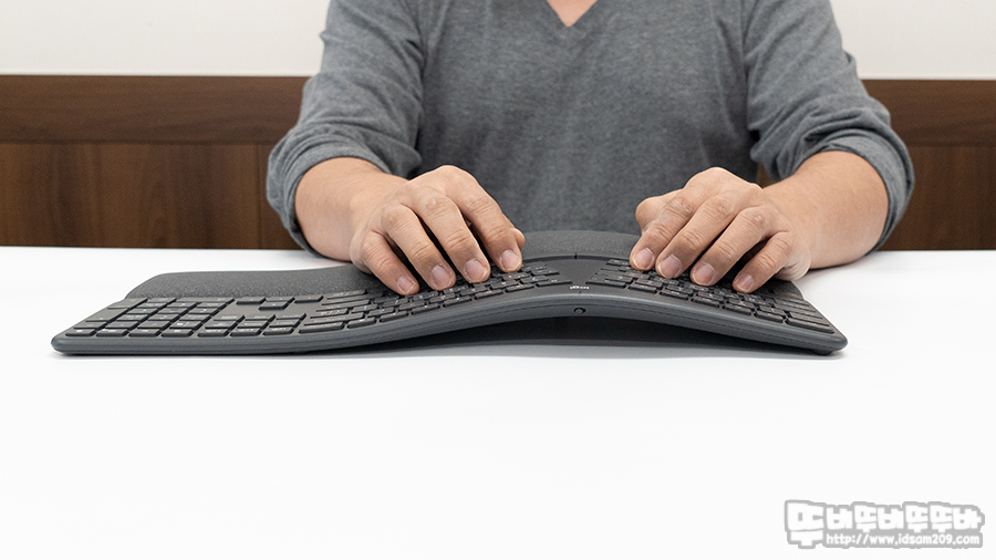 라운드형 곡면이 적용된 로지텍 ERGO K860 무선 키보드는 곡면에 손을 올려 사용하기에 좌,우가 벌어진 자판 배열과 라운드형 곡면에 위치한 키의 높낮이까지 적응이 필요합니다.