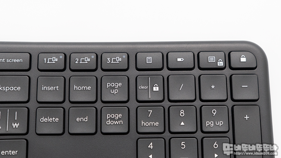 멀티 페어링을 설정하는 이지 버튼, 계산기 호출 버튼, 배터리 잔량 체크 버튼, App 키(Fn 조합 Scroll Lock), 잠금 버튼