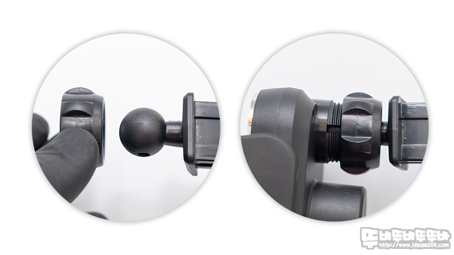 거치대는 조임 너트를 거치대 방향으로 꼽아두고 무선 거치대를 연결하고 조임 너트로 조여서 결합할 수 있습니다.