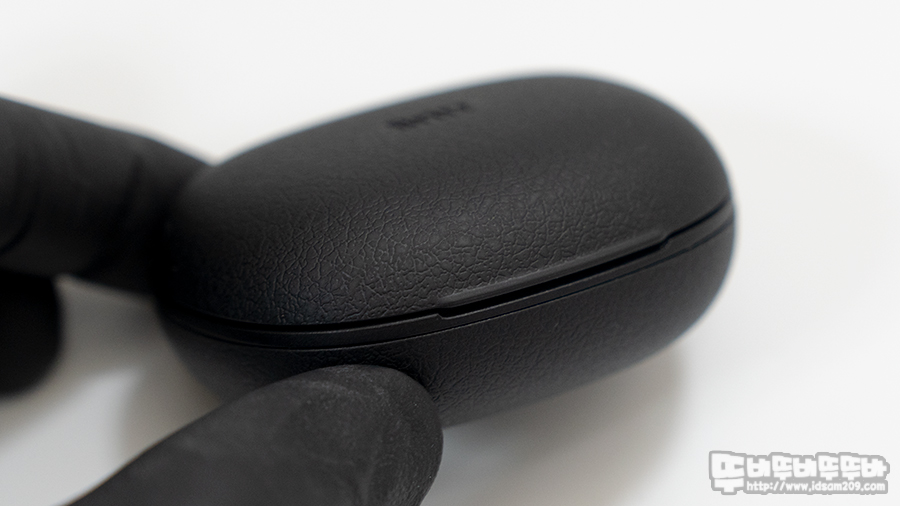 충전 케이스는 종이 패키지와 비슷한 느낌으로 가죽 느낌을 주는 플라스틱 소재가 사용되어 고급스러운 느낌을 주며 충전 케이스 전면에는 오픈이 용의 하게 살짝 돌출된 디자인이 적용되었습니다.