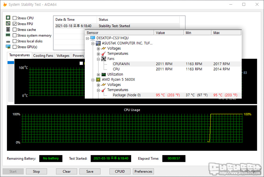 이번에는 CPU를 100% 극한으로 테스트하는 Stress FPU 테스트 시 약 시작하자마자 30초도 안 되어 약 90도를 도달하고 약 57초쯤 95도에 도달했습니다.