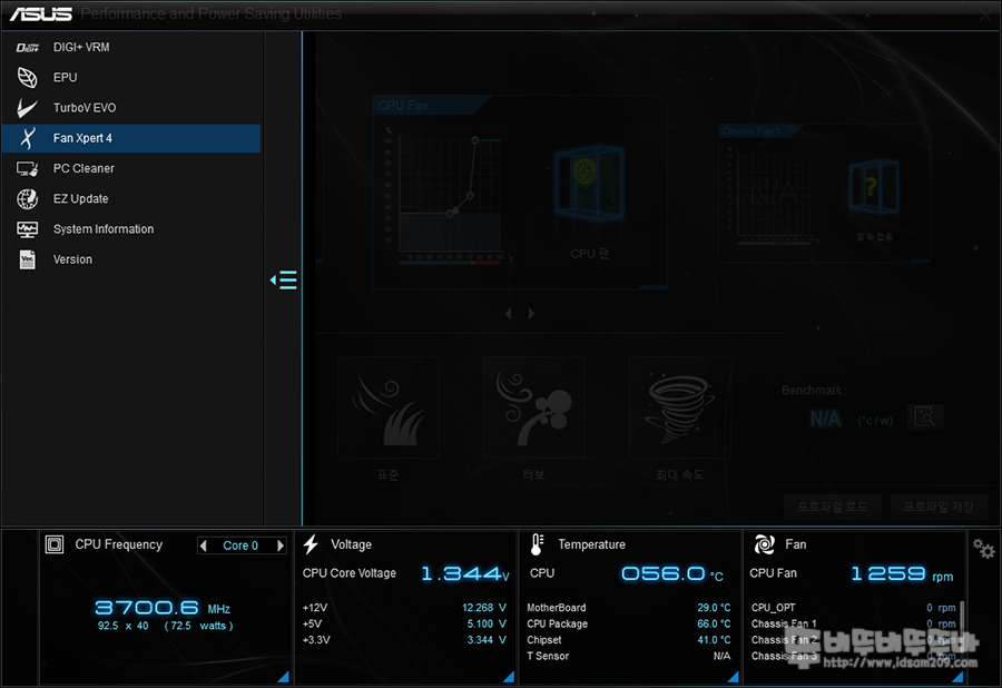 C-MOS의 Q-FAN 컨트롤이 PWM으로 설정되어있는 경우 Fan Xpert 4를 통해 CPU 팬과 AIO PUMP, 시스템 팬의 RPM을 통합적으로 관리할 수 있습니다.