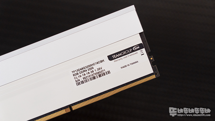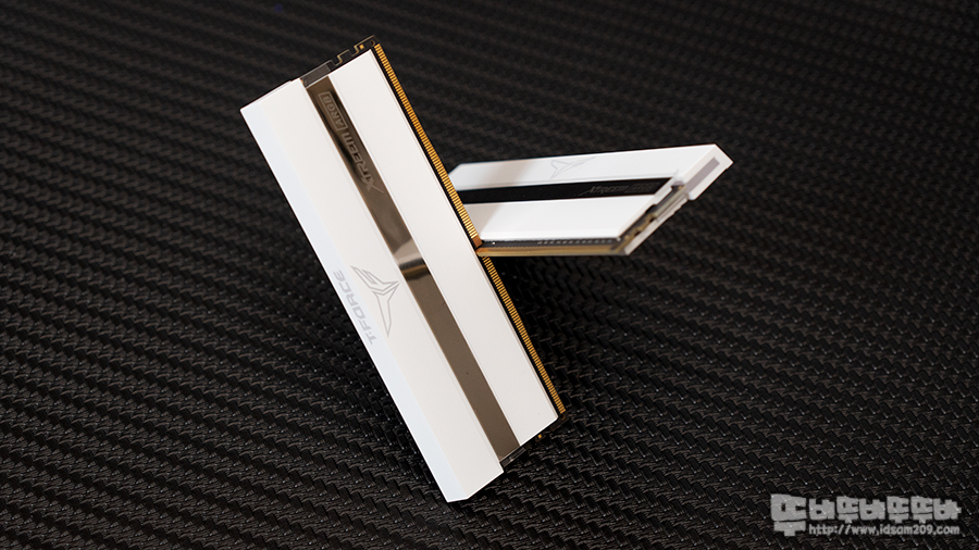 일전에 리뷰했던 TeamGroup T-Force XTREEM는 그린 컬러 메모리는 메모리 전체가 반사되는 유광소재의 플라스틱이 적용되었다면 이번에 리뷰하는 화이트 제품 무광 화이트 재질에 중앙부에 미러 방식의 메탈 띠가 포인트를 주고 있습니다.