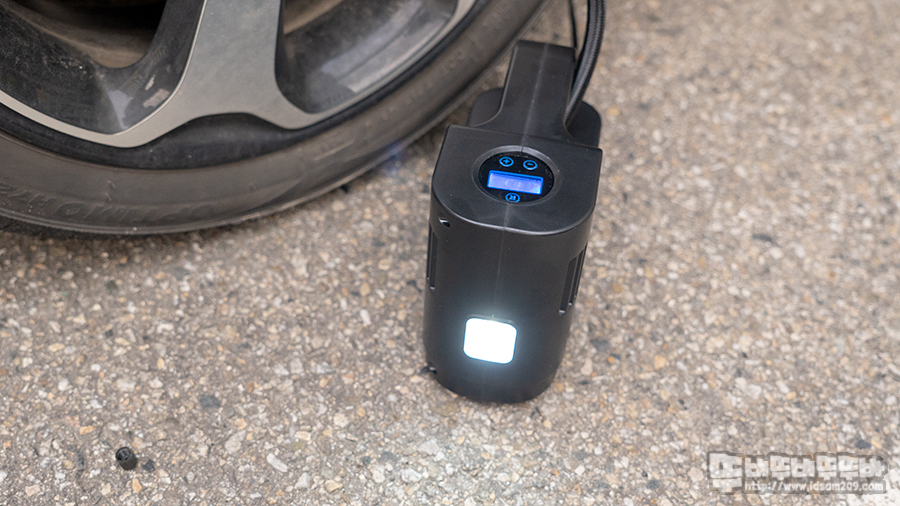 808 차량용 에어 컴프레셔 자동차 공기 주입기 무게가 가볍고 공기 주입 호수의 위치가 조금 애매한 곳에 있다 보니 공기 주입 시 중심을 잘 못 잡고 옆으로 기울어지는 단점이 있지만, 가격 대비 성능을 감안하면 타협할만합니다.