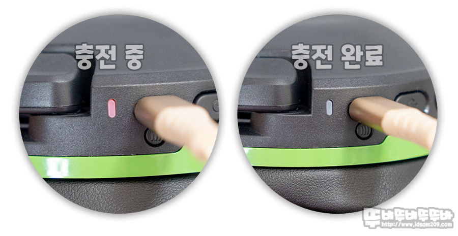 USB-C 단자를 통해 제품 충전 시 LED 인디케이터는 Red LED 점등으로 표시되며 완충 시에는 잠깐 Green LED가 점등되었다가 LED Off로 표현됩니다.