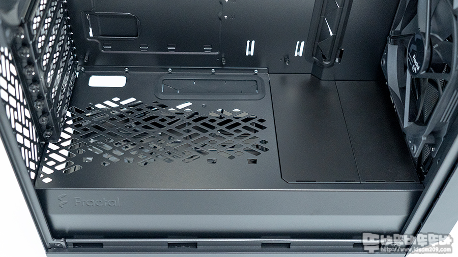 상단 샤시를 제거한 케이스는 메인보드가 장착되는 샤시 부분과 파워서플라이와 HDD 가이드 영역으로 분리되는 챔버구조로 디자인되었으며 메인보드가 장착되는 샤시부분에는 케이블이 샤시 내부로 들어오는 타공부분에 실리콘 커버를 적용하여 깔끔한 케이스 내부를 연출하는 효과를 보여줍니다.
