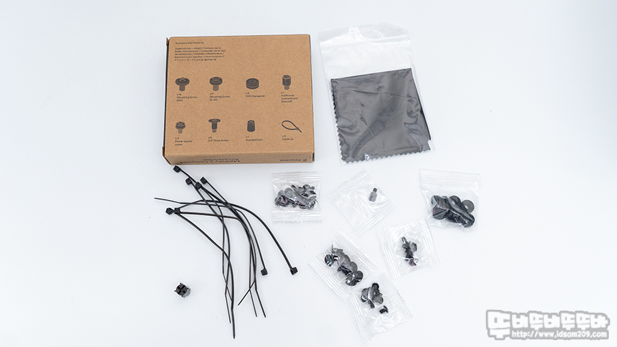 Fractal Design Meshify 2 Compact 부자재 박스에는 나사의 종류와 개수를 이미지로 잘 설명하고 있으며 사용 설명서를 참고한다면 이 나사가 어디에 사용되는지 쉽게 확인할 수 있습니다.