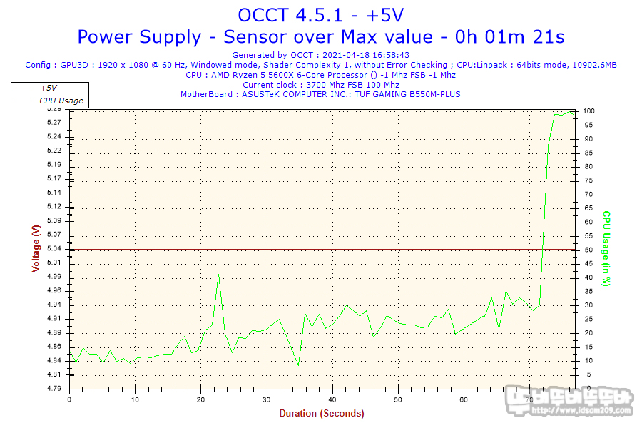 파워서플라이 전용 로드기를 이용한 테스트는 아니지만 OCCT와 AIDA64 시스템 안정화 테스트 시 전압을 확인해보면 안정적인 전압을 보여주는 것을 확인할 수 있습니다.