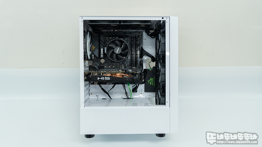 케이스는 메인보드 영역과 파워서플라이 영역이 나뉘는 챔버구조로 케이스 전면과 후면에는 1000±10% RPM 속도와 23.9dBA 소음의 하이드로릭 베어링이 사용된 RGB 120mm 쿨러 사용, 케이스 상단에는 1100 ±10% RPM 속도와 20.5dBA 소음의 슬리빙 베어링이 사용된 일반 120mm 쿨러를 사용하여 총 6개의 쿨러를 기본으로 지원하고 있습니다.