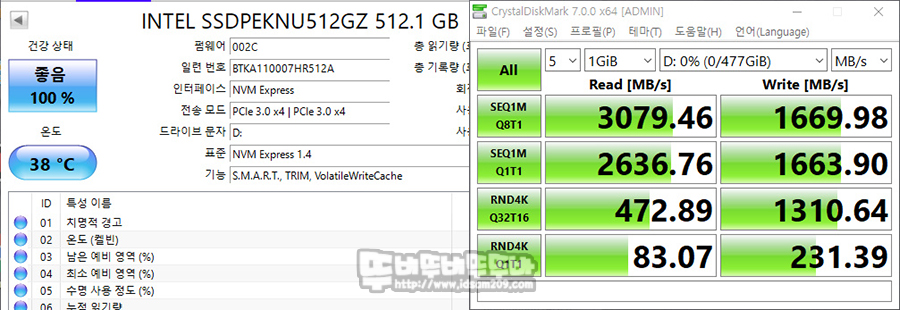 Gen3.0 X4을 지원하는 인텔 670p M.2 NVMe (512MB)는 최대 읽기 속도 3,000MB/s, 쓰기 속도 1,600MB/s으로 테스트 스펙에 준하는 속도를 확인할 수 있었습니다.